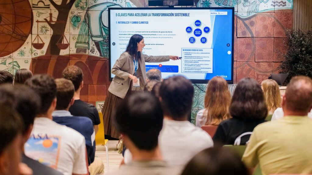 La transformación del sistema alimentario hacia modelos más sostenibles es un desafío inaplazable y España cuenta con una buena posición para abordarla, apuntó Camila Kauer, ESG Project Manager de Forética, en el encuentro con estudiantes, profesorado y profesionales de organizaciones celebrado en la Escuela Técnica Superior de Ingeniería Agronómica y del Medio Natural (ETSIAMN) de la Universitat Politècnica de València (UPV). La experta subrayó que, más allá de acciones aisladas, lo que se requiere es un cambio estructural, capaz de replantear de forma integral cómo entendemos la alimentación: desde la producción hasta los hábitos de consumo.